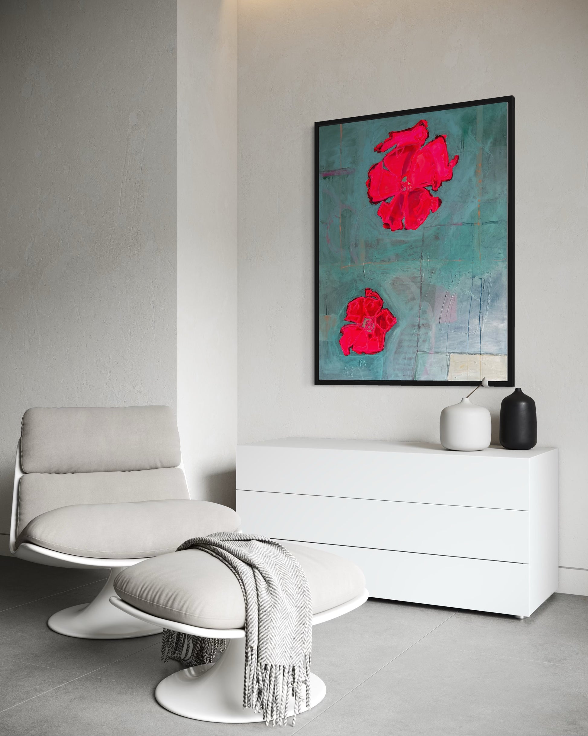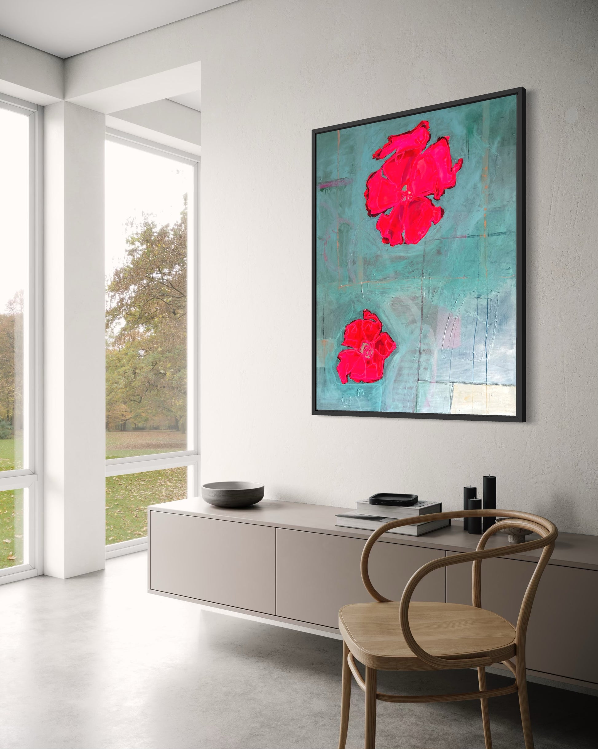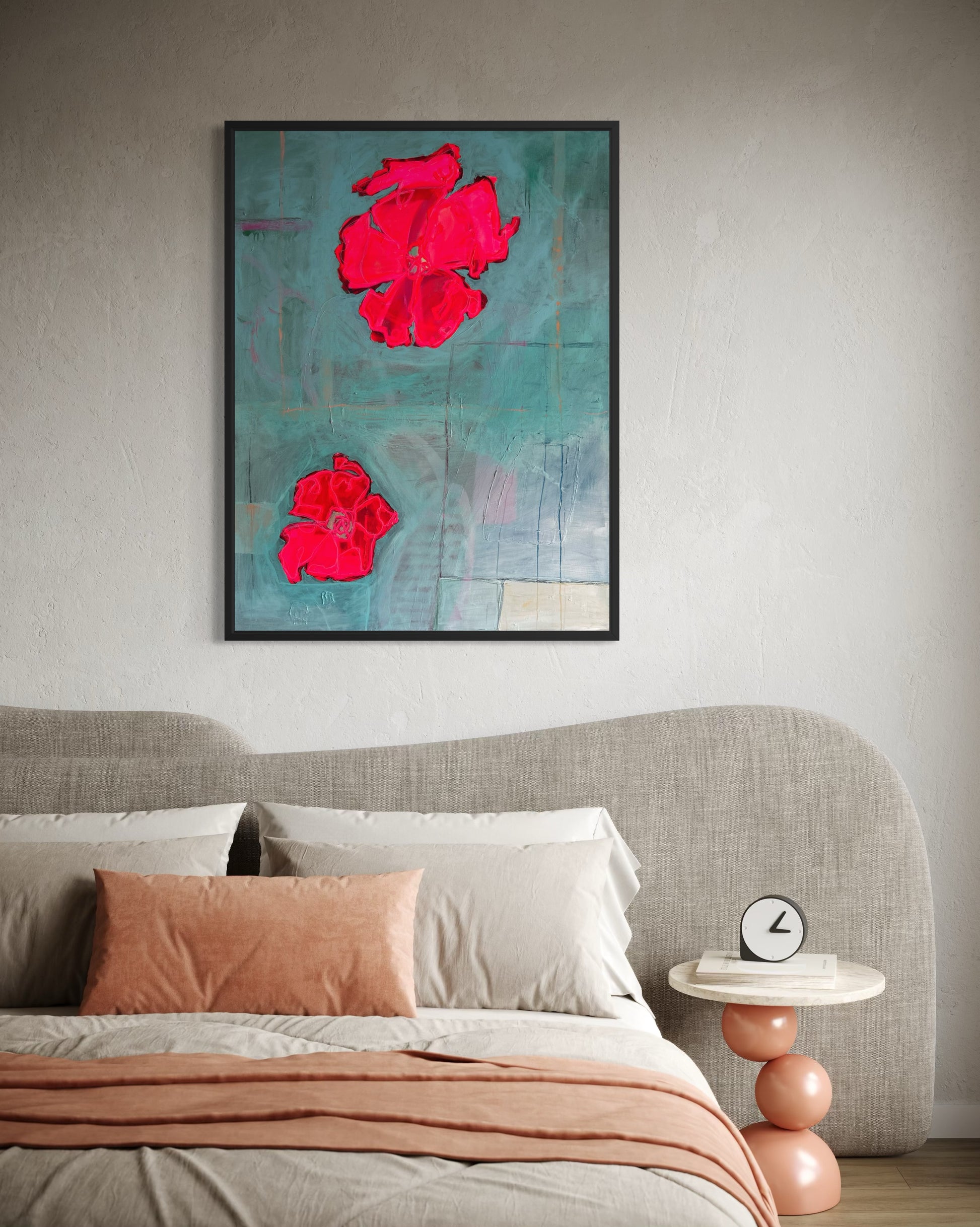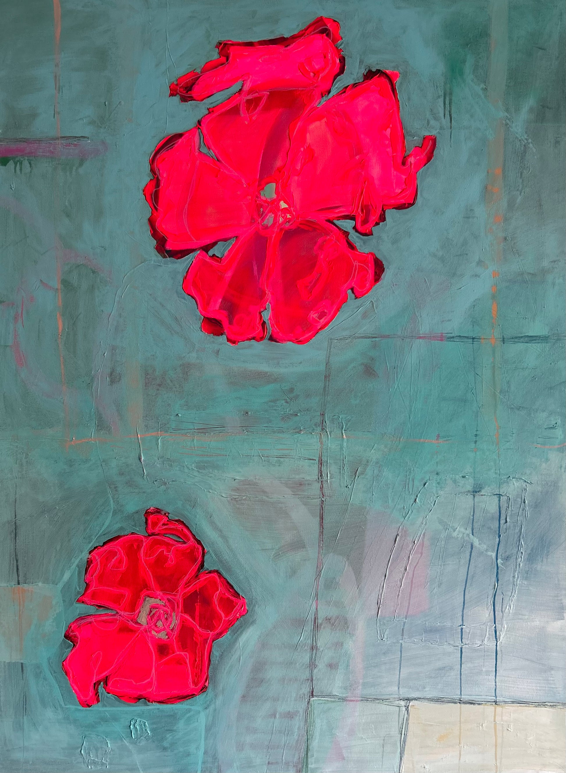 Floral Progress captures the dynamic tension between organic growth and structured space. Vivid pink blossoms emerge from a layered turquoise field, their electric hues pulsating with vitality against a textured, geometric backdrop. The flowers—at once abstract and expressive—suggest evolution and transformation, as if caught in a moment of unfolding energy. Subtle underlayers and gestural marks reveal traces of prior movement, echoing the persistence of nature within an ever-changing environment.