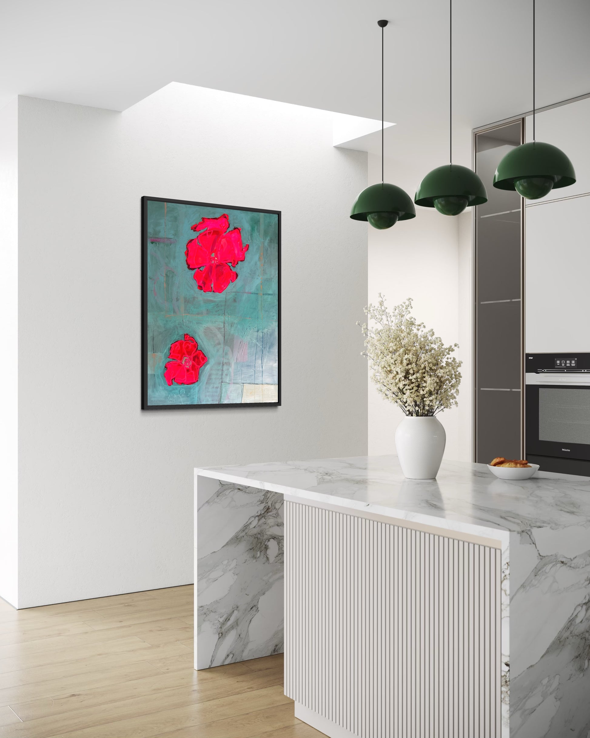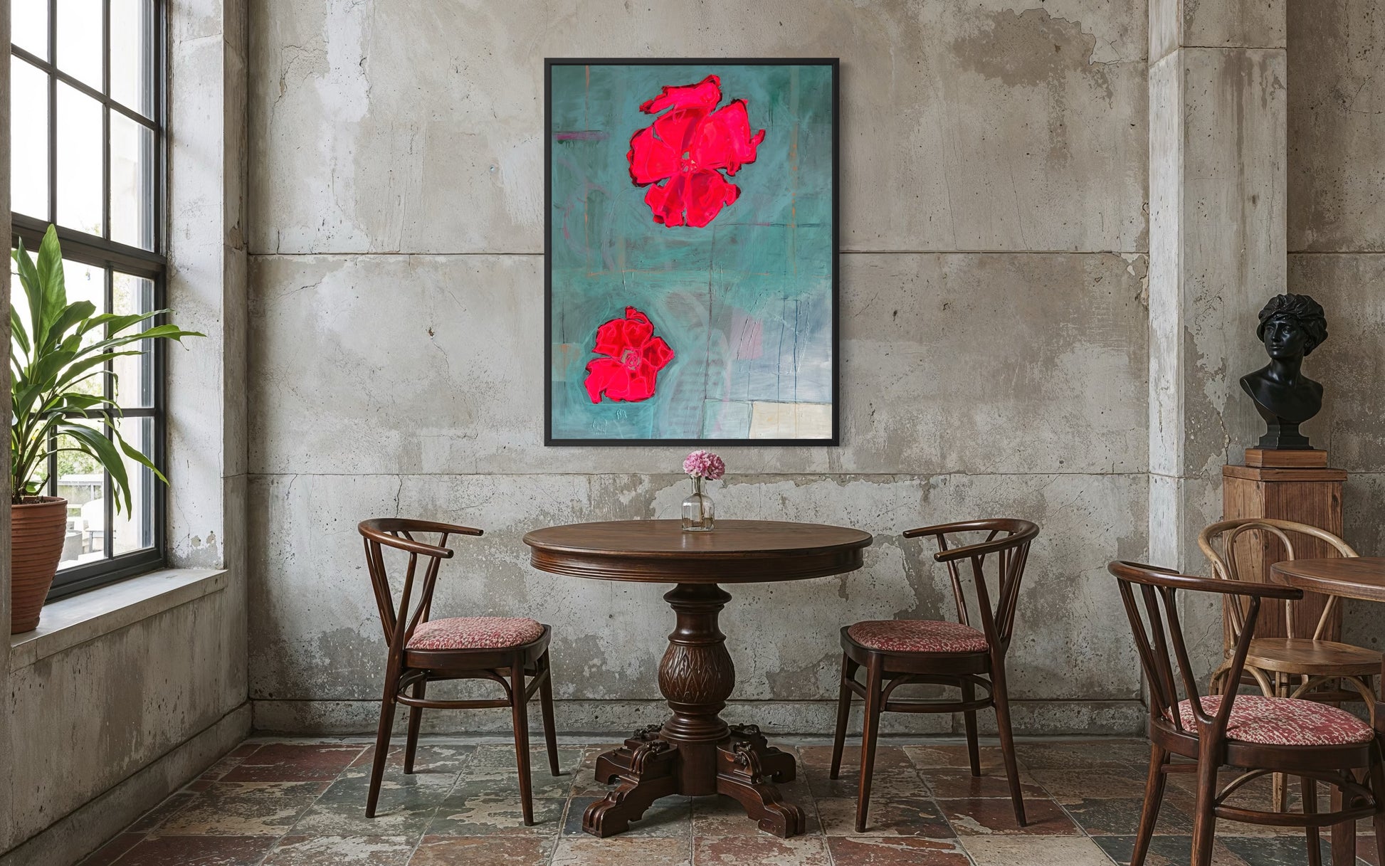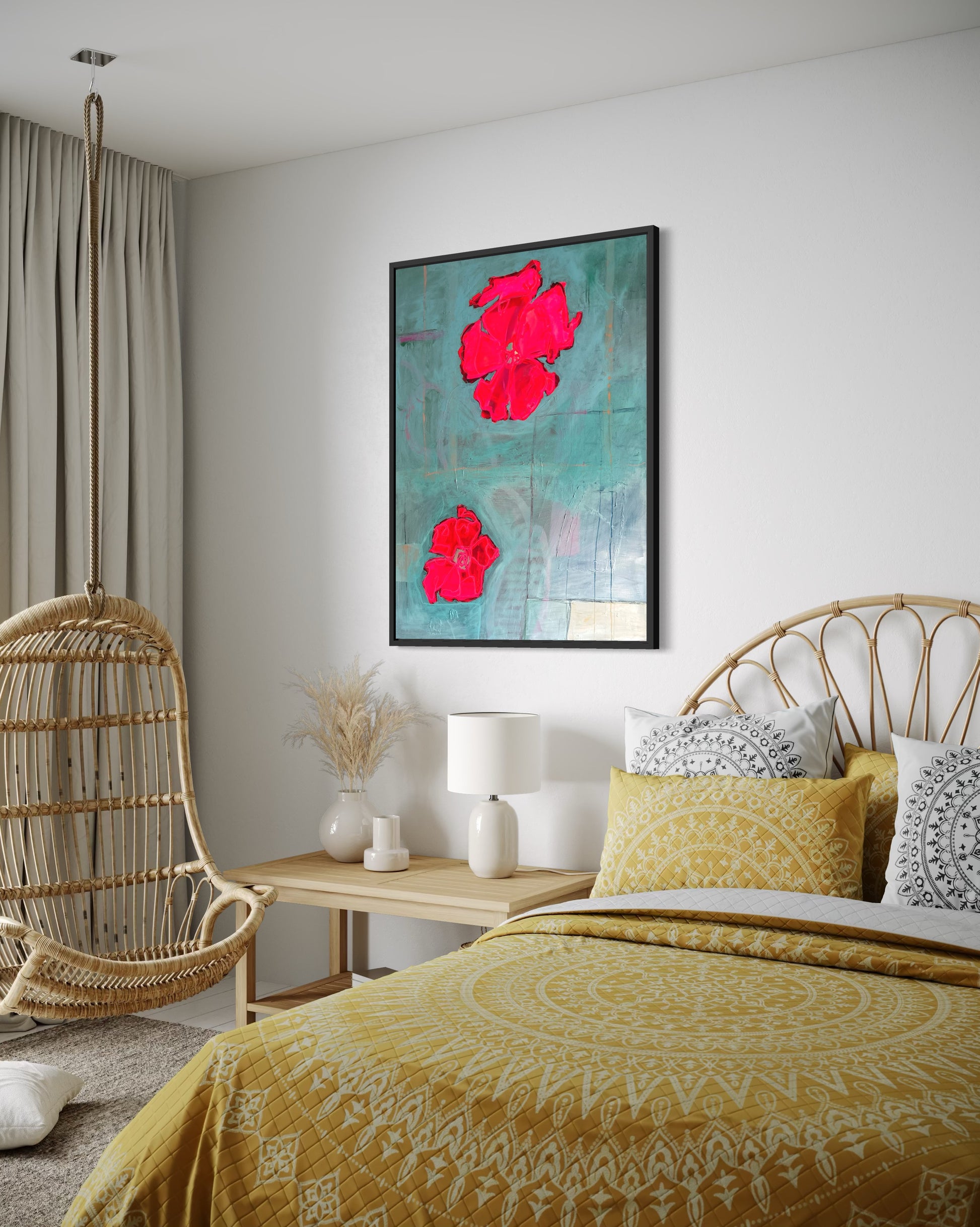 Floral Progress captures the dynamic tension between organic growth and structured space. Vivid pink blossoms emerge from a layered turquoise field, their electric hues pulsating with vitality against a textured, geometric backdrop. The flowers—at once abstract and expressive—suggest evolution and transformation, as if caught in a moment of unfolding energy. Subtle underlayers and gestural marks reveal traces of prior movement, echoing the persistence of nature within an ever-changing environment.