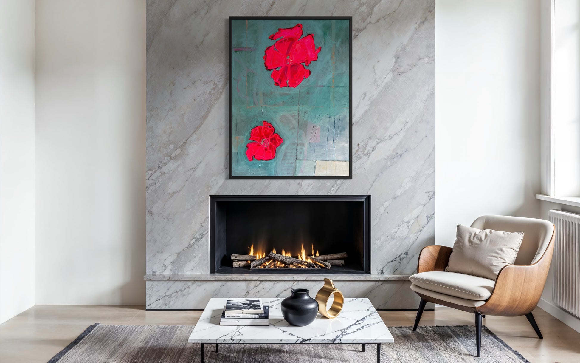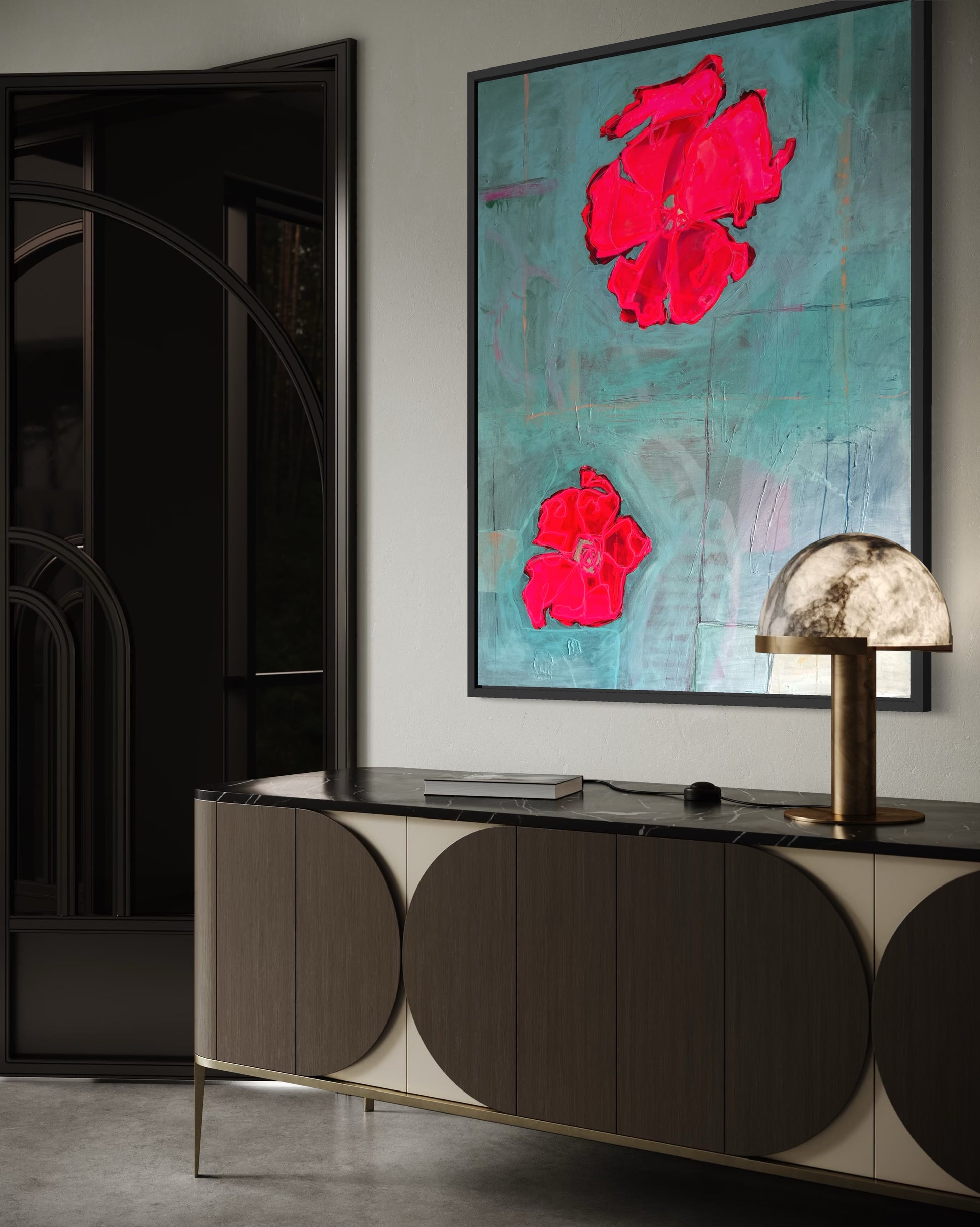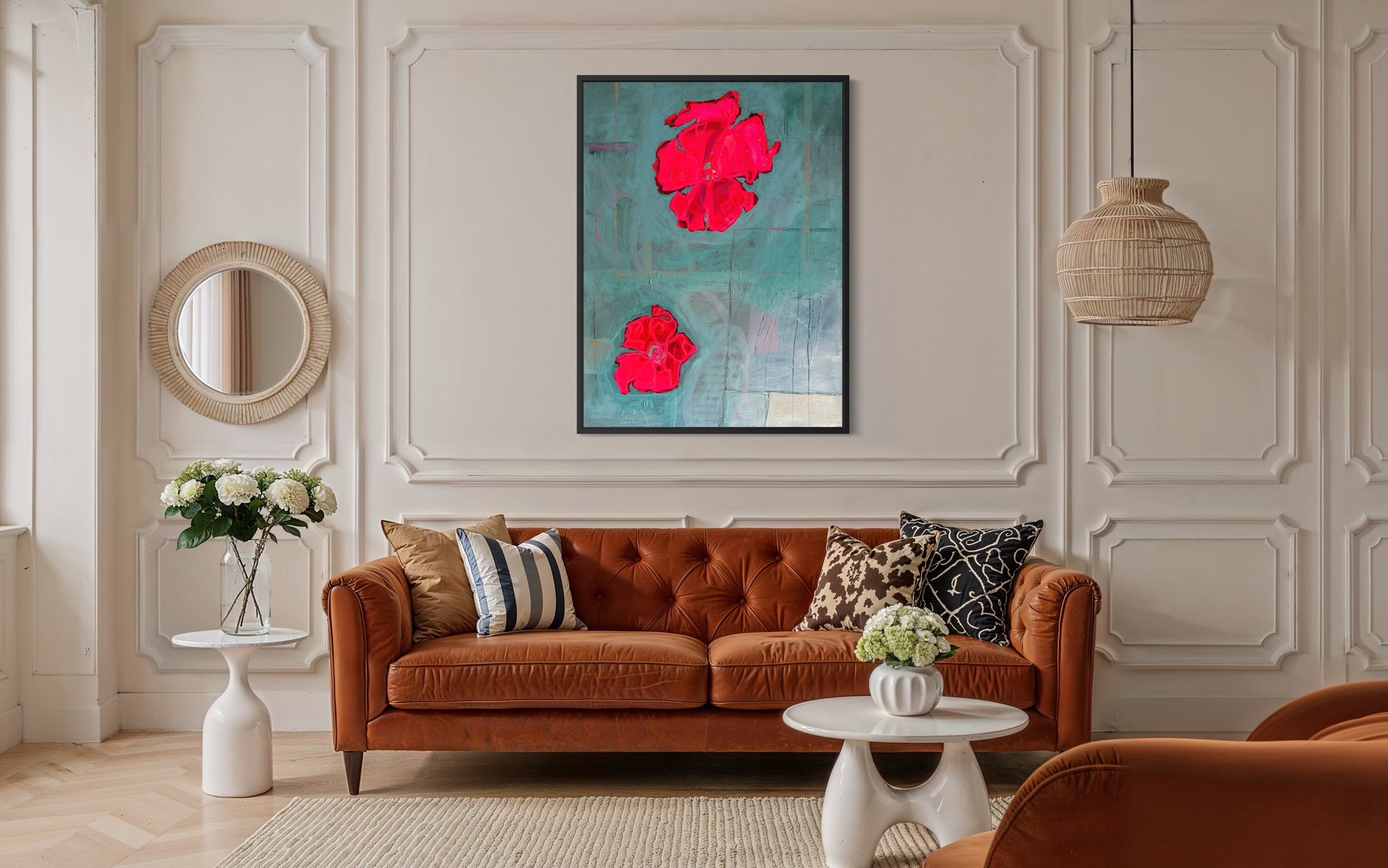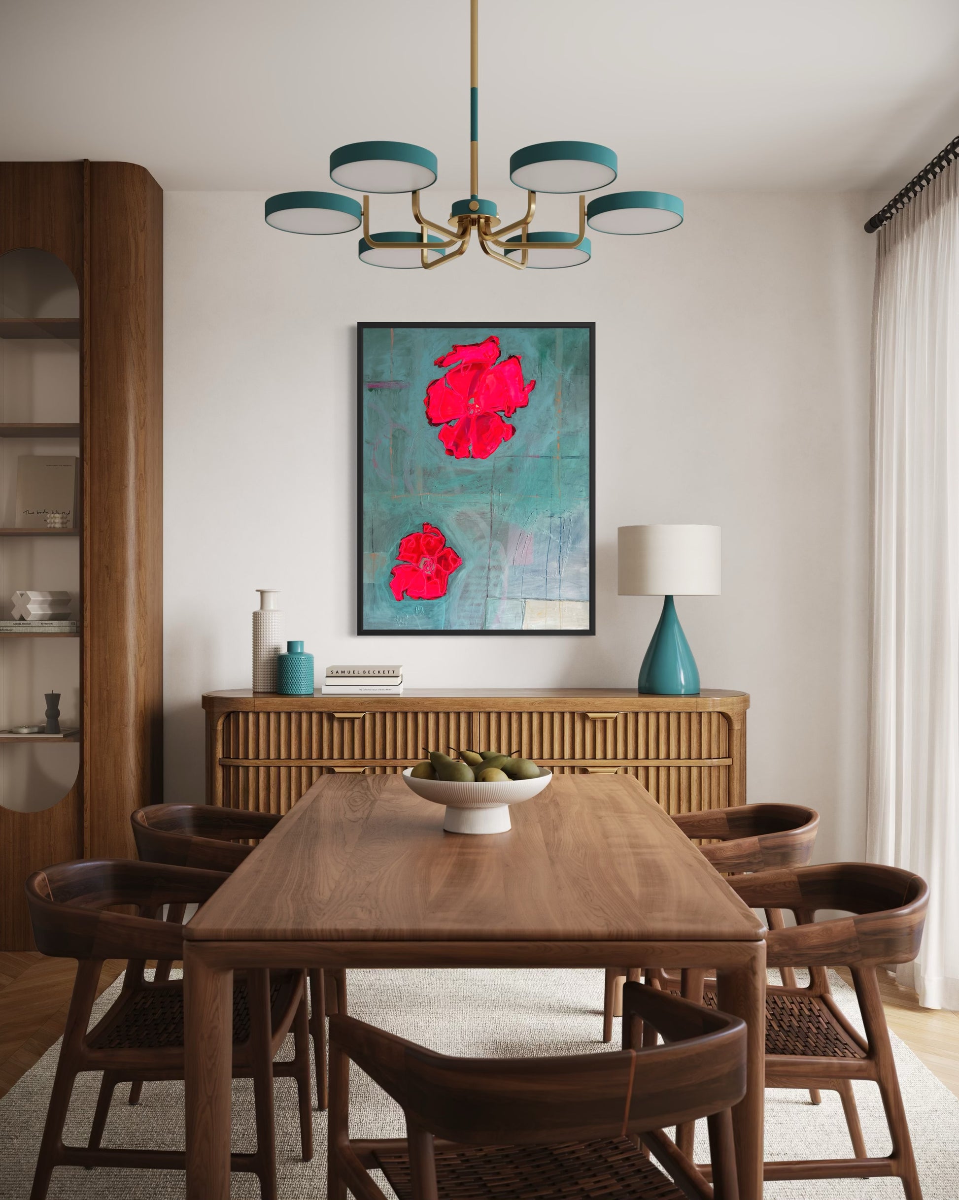 Floral Progress captures the dynamic tension between organic growth and structured space. Vivid pink blossoms emerge from a layered turquoise field, their electric hues pulsating with vitality against a textured, geometric backdrop. The flowers—at once abstract and expressive—suggest evolution and transformation, as if caught in a moment of unfolding energy. Subtle underlayers and gestural marks reveal traces of prior movement, echoing the persistence of nature within an ever-changing environment.